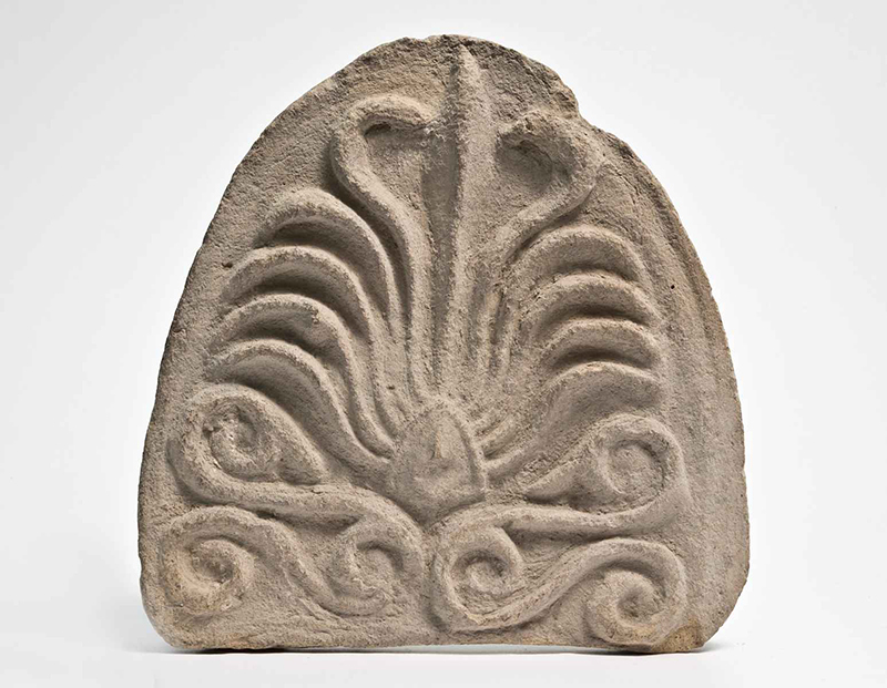 Argilla di color beige chiaro, in frattura argilla beige. Alla base vi sono due elementi terminanti alle estremità in volute, da cui spuntano altri due elementi, che si sviluppano orizzontalmente e terminano in volute, e un triangolo; da questo spuntano undici petali sottili e incavati: il centrale è dritto fino al bordo superiore, i due laterali a questo si curvano verso l'interno, i restanti verso l'esterno.