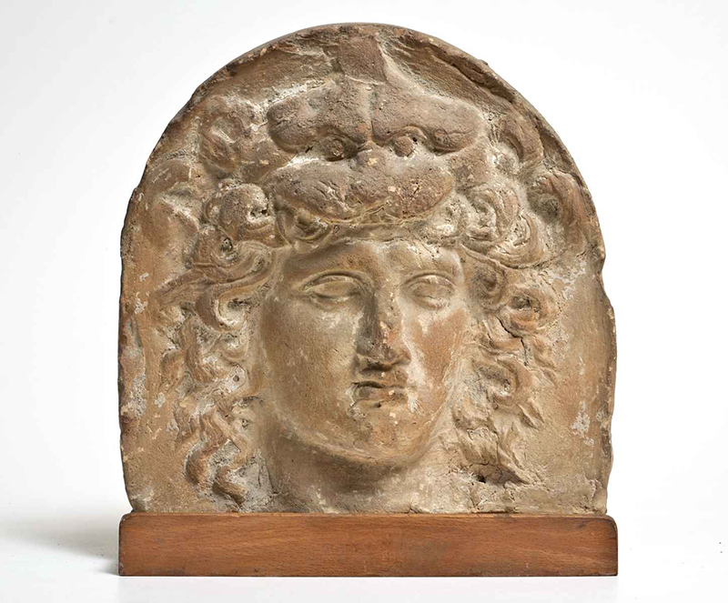 Argilla di color beige scuro, in frattura argilla rossastra. Il volto, forse femminile, è girato verso destra e presenta un naso piuttosto massiccio, con una bocca piccola e carnosa; gli occhi, quasi chiusi, hanno palpebre spesse e sporgenti. La leonté è abbastanza ampia, mentre le alette sono piccole. Le ciocche dei capelli sono scomposte. Potrebbe essere la patrice per la matrice delle antefisse inv. 3791 (T.124) e inv. 2341.
