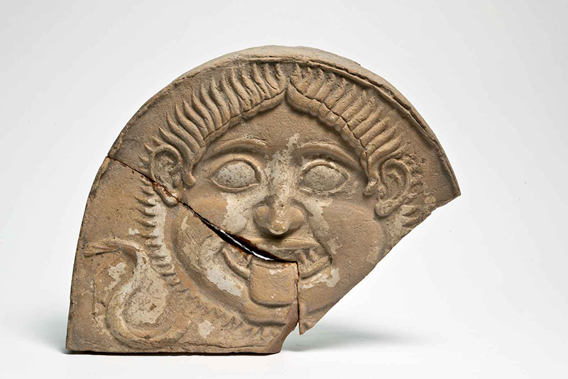 Argilla di color beige chiaro, in frattura color sabbia. Superficie rovinata dalle incrostazioni. Antefissa semiellittica, mancante della parte in basso a destra, con frattura che corre dal bordo sinistro all'altezza dell'orecchio verso la bocca, tagliandola, e scende verticalmente sul lato destro della lingua. E' presente un serpente a sinistra che esce dalla barba.