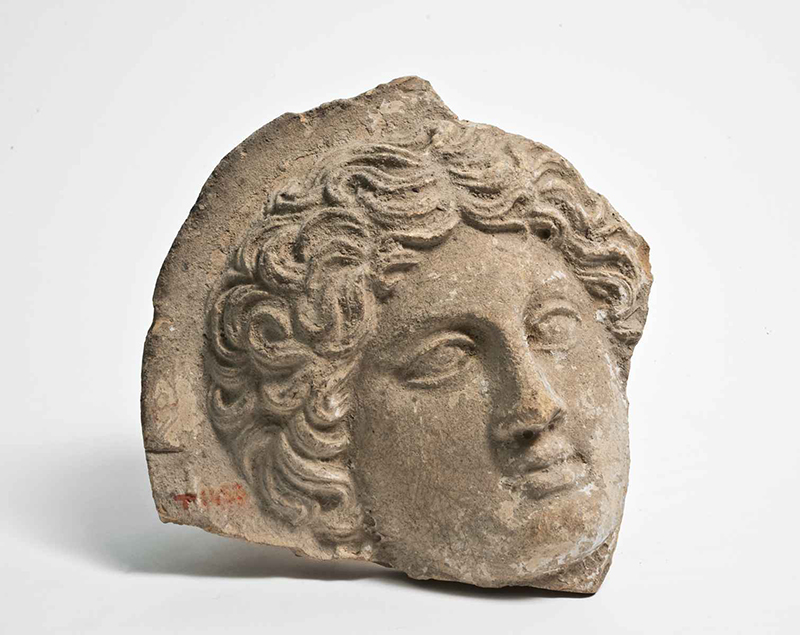 Argilla di color marroncino a causa delle incrostazioni, al di sotto color beige chiaro; in frattura argilla rossastra. Si conservano solo il volto e la chioma; proviene dalla stessa matrice dell'antefissa inv. 3805 (T.40).