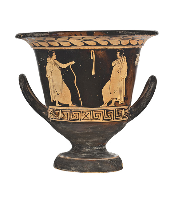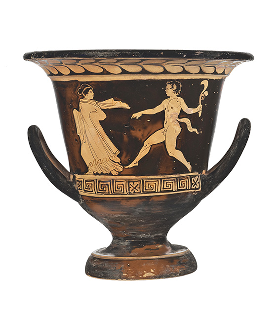 Argilla color camoscio (7.5 YR 6/4 Munsell); vernice lucente, in alcuni punti diluita con qualche scalfittura; arrossamento in vaste zone per un'errata cottura, specialmente sul bordo interno dell'orlo, al centro della scena del cd. lato A e sul piede. Il vaso presenta una larga imboccatura con orlo estroflesso distinto e labbro arrotondato; il corpo svasato poggia su un piede troncoconico con corto stelo. Presenta alte anse a bastoncello, impostate sul ventre e incurvate verso l'alto. Decorazione del lato A: è raffigurata una menade inseguita da un satiro.La menade, con le braccia leggermente piegate, corre verso sinistra guardandosi dietro; porta i capelli raccolti sulla nuca racchiusi da una sottile fascia, è vestita con un lungo chitone coperto da hymathion che svolazza per la corsa. Il satiro, rappresentato nudo con coda ed orecchie equine, corre a sua volta verso sinistra, e sembra spostarsi sulle punte dei piedi, mentre regge con la mano sinistra un elemento vegetale. Decorazione del lato B: sono raffigurati due giovani ammantati a colloquio, ritratti stanti e di profilo, l'uno di fronte all'altro e rivolti verso il centro della scena. Entrambi hanno il baricentro spostato all'indietro con il peso che poggia su una sola gamba, mentre l'altra è leggermente piegata, a riposo. Il giovane a sinistra si appoggia con il braccio destro, libero dall' hymathion, a un bastone. Tra i due, in alto sullo sfondo, una tenia appesa. La decorazione accessoria esterna è costituita, sotto il labbro, da un tralcio di foglie di olivo, incorniciato da due fasce risparmiate, di cui quella superiore è incastonata all'interno di una sottile modanatura. La parte sottostante le scene figurate, inoltre, è arricchita da un meandro interrotto da quadrati in cui sono inscritti una croce di S. Andrea e quattro trattini. Una sottile fascia risparmiata decora il bordo superiore dello spessore del piede. La zona tra gli attacchi delle anse e la parte interna delle anse sono risparmiate. All'interno si notano due fasce risparmiate, di cui la prima - sottile - corre lungo il punto in cui si imposta l'orlo; l'altra, più spessa, si trova all'altezza del punto in cui, sulla parete esterna, comincia la scena figurata.