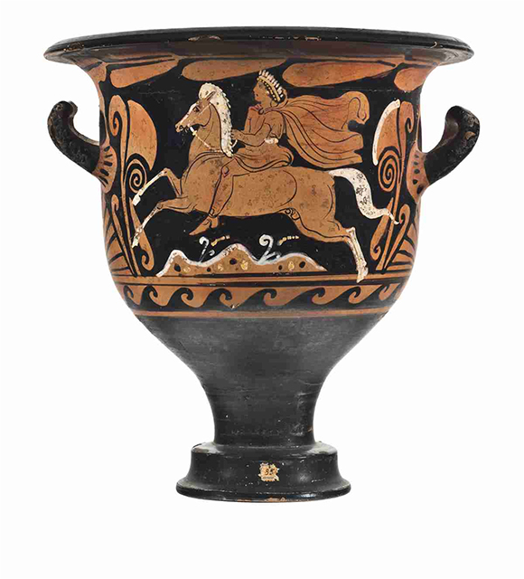 L'imboccatura del vaso è ampia, con orlo estroflesso segnato da una leggerissima modanatura concava; il corpo è campaniforme e, con un corto stelo, poggia su un piede modanato, con profilo a cavetto e listello alla base. Le anse a bastoncello sono impostate orizzontalmente a metà della vasca e incurvate verso l'alto. La vernice nera è uniforme, opaca, e copre interamente anche l'interno della vasca, risparmiando però due filetti all'interno e una fascia sotto l'orlo; dettagli, anche piuttosto estesi, sono sovradipinti con vernice bianca o gialla. Il colore dell'argilla oscilla tra Munsell 5YR 6/6 (reddish yellow), 2.5YR 5/8 (red) e 10R 5/8 (red). Il lato A è dominato dalla figura di un cavaliere: la figura si estende fino al di sopra dei motivi accessori sull'orlo, ai lati e oltre la doppia linea nera che fa da base alla scena. Cavallo e cavaliere sono di profilo, al galoppo verso sini-stra; il giovane, nell'atto di tenere le redini del cavallo, porta sul capo, dai corti capelli, una corona radiata decorata con una fila di perle e indossa orecchini rotondi, il tutto sovradipinto in bianco-giallo. Indossa una tu-nica italica a maniche corte cinta in vita da un cinturone, anch'esso reso in bianco, e porta un mantello fissato sul petto con una fibula, che svolazza alle sue spalle per la velocità del movimento; le calzature sono appuntite. Il cavallo è al galoppo, con le zampe anteriori sollevate, la destra leggermente più in alto; le zampe posteriori, pur di profilo, sono visibili entrambe. L'animale è ben caratterizzato con numerosi dettagli sovradipinti in bianco: la folta criniera, una striscia sul muso, le redini, la parte bassa delle zampe e la coda, ma è privo di qualunque tipo di sella. La scena è completata dal dettaglio paesaggistico del terreno, presente solo tra le zampe del cavallo e non facente da appoggio, reso con una linea ondulata bianca a limitare un'area risparmiata riempita con pallini bianchi e neri; spunta una coppia di elementi vegetali, con due foglie arricciate e un fiore a spiga, inclinati verso destra, come sospinti dal vento. Sul lato B, due giovani ammantati affrontati. Quello a sinistra è più slanciato, di profilo verso destra, con un piede leggermente avanzato; porta sul capo una corona a corti raggi decorata con perline ed è completamente coperto dal mantello, sorretto, parrebbe, dal braccio sinistro e con un lembo che ricade dietro la schiena. Le calzature a punta sono del tutto prive di dettagli. L'altro ha una forma più tozza, perfettamente di profilo verso sinistra, con la medesima corona radiata e i corti riccioli che scendono sulle spalle. L'himation lo copre completamente ma è drappeggiato in maniera più semplice rispetto a quello dell'altro personaggio; le scarpe sono invece dettagliate. In alto, tra le due teste, una palla, riempita da una croce di S. Andrea inscritta in un cerchio, con triangoli tra i bracci; a destra, dietro la nuca del giovane a destra, un altro riempitivo circolare, con un punto nero nel mezzo. I motivi decorativi accessori comprendono un tralcio di alloro sinistrorso sull'orlo e un fregio ad onde marine de-strorse inquadrato da due filetti risparmiati al di sotto della decorazione figurata principale. Alla base delle anse, dietro le quali il corpo del vaso è a risparmio, un motivo a baccellatura, molto corsivo; al di sotto delle anse, una palmetta, molto schematica, con ai lati fiori a campanula con l'orlo sovradipinto in bianco e girali. Sul piede, in corrispondenza del lato A, è presente ciò che resta di una vecchia etichetta: '85', mentre l'attuale numero di Inventario Generale è tracciato a inchiostro rosso all'interno dell'orlo.