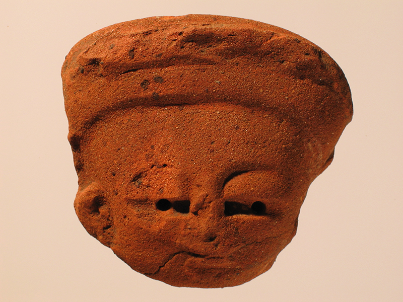 Testa umana di stile Usulután in terracotta rossa, modellata in maniera piuttosto sommaria. L’interno è pieno. Le orecchie, il naso, le labbra e le palpebre sono parzialmente sbocconcellati. Anche la patina esterna appare ruvida e discontinua. Gli occhi sono costituiti dalla consueta fessura orizzontale, al centro della quale è stato praticato un foro. La fronte alta e appiattita si sviluppa in alto con una forma trapezoidale: questa termina in una sorta di turbante, le cui fasce in rilievo avvolgono strettamente la testa.