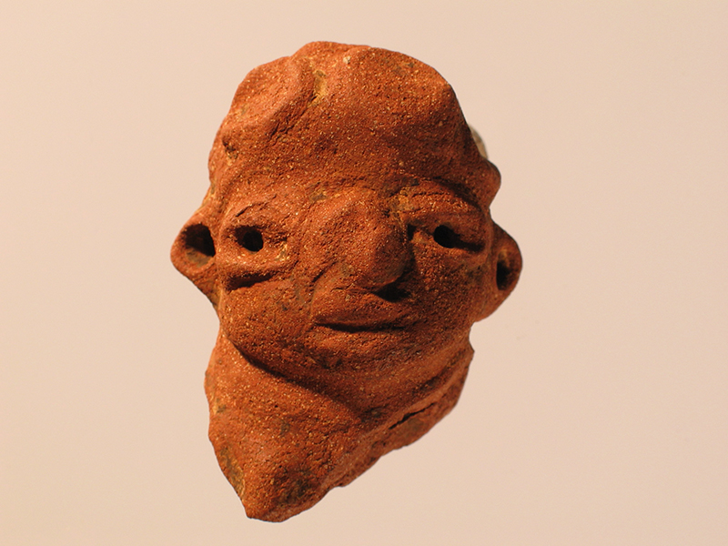 Testa umana di stile Usulután modellata in terracotta rossa. L’immagine è plasmata a tutto tondo, con interno pieno. I tratti somatici sono abbozzati in modo grossolano. Gli occhi hanno l’iride forato. Anche le orecchie, sporgenti, sono dotate di un foro piuttosto profondo che probabilmente era riempito con bitume o altro materiale decorativo. La particolarità di questa testina è senz’altro il copricapo che consiste in una serie di circoli con il bordo rilevato che ricoprono la parte superiore e posteriore del capo. È ancora presente un frammento del collo e qualche piccola traccia di pittura.