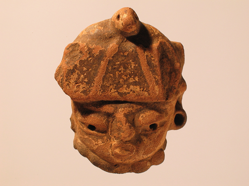 Volto umano di stile Usulután in terracotta rosata rivestito da ingobbiatura color crema, annerita. Rappresenta un personaggio ingioiellato e dotato di un imponente copricapo. La larga fascia frontale rettangolare è sormontata da una testa di uccello che spicca in posizione centrale. Sotto al mento è presente un filo di perle sferiche. Il lobo sinistro è abbellito da un orecchino circolare mentre l’orecchio destro manca del tutto. Il naso è adunco ma scheggiato, gli occhi hanno l’iride forato. Manca la parte sinistra del copricapo. Un foro sopra l’orecchio destro comunica con una cavità interna.