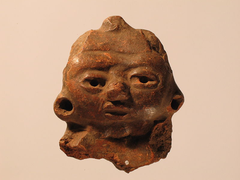 Frammento di figurina antropomorfa di stile Usulután di argilla rossa, a lavorazione piena. La figura, spezzata al petto, è stata ingobbiata con una soluzione di argilla fine mista ad acqua che si è annerita durante la cottura. Il personaggio rappresentato porta grandi orecchini circolari, individuati da un foro impresso in profondità, e un copricapo che raffigurava un uccello con le ali aperte: le estremità sono oggi spezzate e il muso del volatile appare smussato. Gli occhi sono resi con efficacia con la perforazione centrale dell’iride e le palpebre in rilievo.