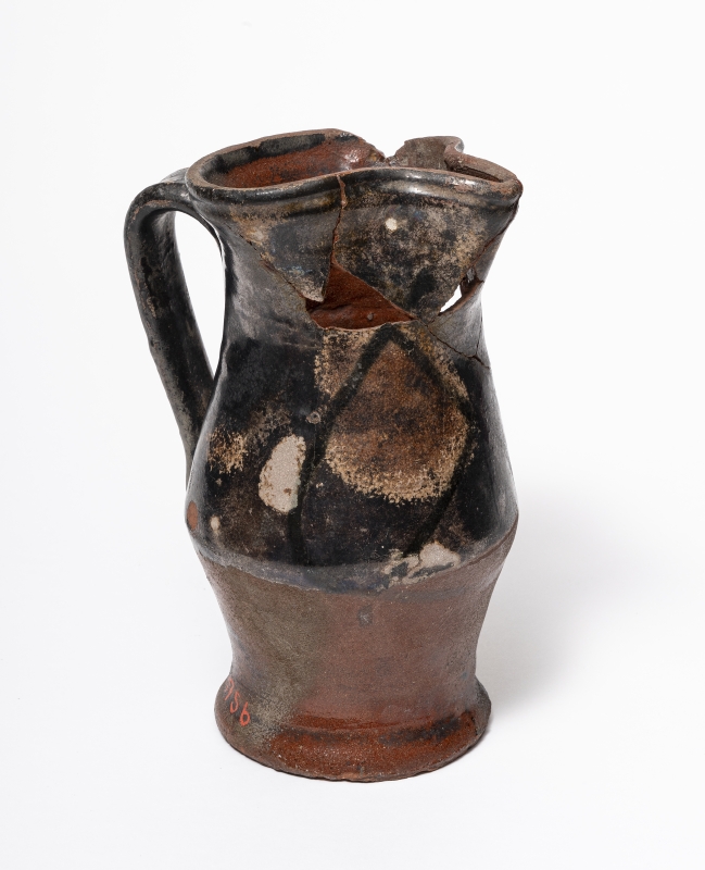 Brocca carenata a sviluppo verticale con piccola bocca dal beccuccio pizzicato e orlo segnato da linea impressa; ansa a nastro con segno dell'impressione del dito all'attaccatura al ventre dove è creato una specie di ricciolo; piede estroflesso con base piatta con una X graffita. Sul ventre è dipinto in modo sommario un medaglione quadripartito.
