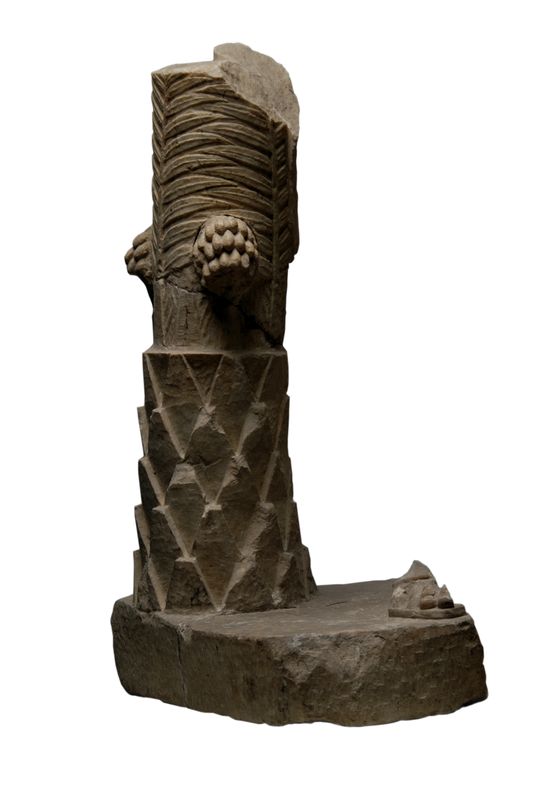 Su un frammento del plinto squadrato rimane parte del piede sinistro di uomo, poggiato su suola, e la base del sostegno raffigurante un tronco di palma dalle grosse squame triangolari nella zona inferiore e lievi arrotondate superiormente; dal tronco emergono due grappoli di datteri disposti su file orizzontali.