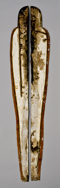 L'involucro per la mummia è fatto in cartonnage, un materiale ottenuto dalla sovrapposizione di strati di stoffa di lino (o di papiro) incollati e pressati, la cui superficie poi veniva stuccata con gesso e dipinta; accuratamente tagliato probabilmente tra la fine del XIX e l'inizio del XX secolo per esporre la mummia che era al suo interno, ha ora una parte anteriore e una parte posteriore, la quale composta da due pezzi simmetrici longitudinali, uniti originariamente da legacci di fibra naturale, priva di testo e di figure. La parte superiore, invece, è riccamente decorata: il volto presenta una singolare espressione di bellezza e perfezione di modellato, la parrucca è a due bande che ricadono sul petto e sul collare usekh. Sul vertice del capo è raffigurato uno scarabeo. Il volto e parte del petto sono coperti da una sostanza apparentemente bituminosa di colore scuro. Al di sotto del collare si sviluppano diversi registri decorativi sovrapposti: - La dea Nut ad ali spiegate, accompagnata da due brevi iscrizioni geroglifiche che recitano "Behdety dio grande"; - Al centro il falco Horo, con disco solare in capo e ali spiegate, regge in ambedue gli artigli il simbolo shen dell’eternità e ha un cobra sulle ali. Sopra le ali, su ciascun lato, tre divinità funerarie mummiformi in piedi: a sinistra Ra a testa di falco, Amseti con testa umana e Hapi a testa di babbuino (dietro vi è un falco sopra uno stendardo dell'Occidente); a destra Atum, Kebehsenuf a testa di falco e Duamutef con testa di sciacallo; dietro ancora un airone su uno stendardo. Restano tracce dei nomi delle divinità funerarie in geroglifico; - Al centro vi è il feticcio di Abido, col disco solare alla base della corona atef e un serpente ureo con la corona dell’Alto Egitto; è fiancheggiato a destra dal dio Thot a testa di ibis, dalla dea Uto dalla testa leonina e dal corpo di serpente munito di ali, e dal simbolo dell'Occidente; a sinistra dal dio Horo a testa di falco, di nuovo la dea Uto alata e stavolta lo scettro sekhem. Tra le ali della dea compare un ariete su stendardo; - La barca celeste Henu, al centro, è collocata entro un naos e presenta uguali caratteristiche rispetto a quella del coperchio. Adorano la barca due dee inginocchiate su un basso podio: a sinistra la dea Iside "signora dell’Occidente", inginocchiata, e a destra Nefti "sorella del dio, signora dell’Occidente"; - Al centro della scena si erge il pilastro djed, qui identificato con Osiride in quanto porta la corona ated, lo scettro e il flagello, oltre che la mantellina che ricopre di solito le spalle di Osiride. L'identificazione è garantita anche dalla breve iscrizione geroglifica, che recita "Osiride, signore dell'eternità". Il pilastro è affiancato a sinistra da un ibis su uno stendardo davanti ad un genio mummiforme a testa di coccodrillo accucciato su un piedistallo, a destra da un falco su stendardo e un genio mummiforme a testa di falco. Le due brevi iscrizioni alle estremità chiariscono l'azione rappresentata: "Fare protezione sull'Osiride (= il defunto)". - La zona centrale del rialzo dei piedi è occupata da un testo geroglifico distribuito su tre colonne. Ai lati di quest'ultima è raffigurato uno sciacallo accucciato in mezzo a segni riempitivi, e con due differenti iscrizioni che lo identificano: a sinistra "Upuaut meridionale, guida delle Due Terre, seguace dell’Enneade di Osiride", a destra "Upuaut settentrionale, guida del cielo, seguace dell’Enneade di Horo".