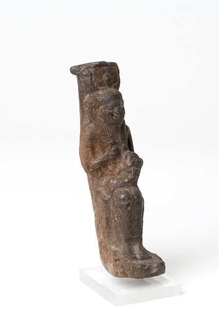 Donata al Museo nel 1935, questa statuina rappresenta con tutta probabilità un’evoluzione molto tardiva del tipo della Iside che allatta Horo. Il materiale (terracotta rivestita di una vernice nera), la tecnica di fabbricazione e lo stile con cui è fatta ricordano alcune imitazioni di statuine funerarie che si possono datare all’Età Bizantina (V-VII secolo d.C.), se non a quella Tardo-imperiale romana (III-IV secolo d.C.). Un ulteriore dato a sostegno di quest’ipotesi di datazione è costituito dalle differenze rispetto all’iconografia tradizionale: la dea porge il seno destro invece del sinistro, pur sostenendolo con la mano destra, e il copricapo è frainteso: le corna sono rappresentate come delle piume, dalle estremità rigonfie ed arrotondate, e quella che normalmente sarebbe la base del diadema diventa invece una sorta di abaco sovrapposto ad esso. Alla base del disco solare vi è un ureo. La figura di Horo è molto stilizzata, ed è difficile distinguerne i dettagli. La figurina è stata eseguita con uno stampo per la parte anteriore, mentre il retro è stato rifinito probabilmente a stecca. Alcuni dettagli, come i tratti del volto e della parrucca, nonché la linea che decora la veste e le dita dei piedi, sono stati realizzati ad incisione.