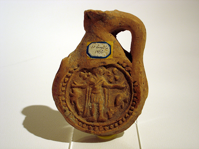 Ampolla piatta in argilla nocciola rosata, depurata, priva di un’ansa, con scheggiature sul bordo del collo e sull’ansa superstite. Incrostazioni sulla superficie. Sulle due facce dell’ampolla, entro un medaglione piatto delimitato da un bordo perlinato che circoscrive un anello a rilievo, vi è la medesima scena: San Menas, con l’abito militare, in atteggiamento di preghiera. La testa è inquadrata da una croce greca sulla destra e da una croce a forma di fiore quadripetalo sulla sinistra. Ai piedi del santo, i due cammelli sono di dimensioni diverse (quello sinistro è più piccolo e senza coda).