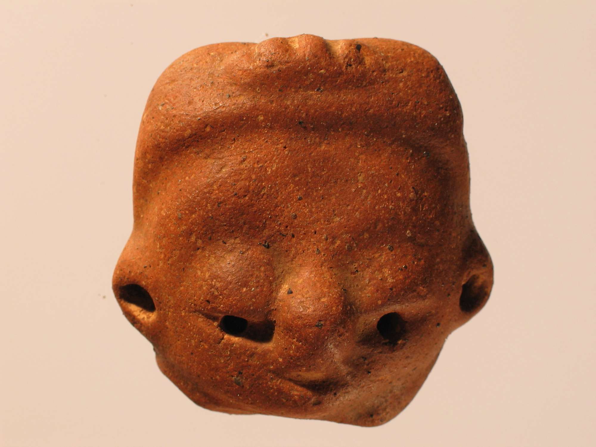 Testina umana modellata in modo approssimativo in terracotta rossa. Il volto risulta dominato dalle dimensioni della fronte che si allunga eccessivamente verso l'alto. Sulla sommità si nota la fascia frontale del copricapo, definita da un leggero rialzo e ornata da un elemento dentato in rilievo che si ripete dietro. I tratti somatici emergono appena dalla superficie che conserva ancora un aspetto lucido.