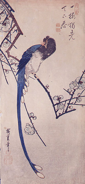 Su un ramo di pruno fiorito, usuale metafora della primavera, si evidenzia la sinuosa figura di un uccello del paradiso blu, caratterizzato dalle due lunghissime e sottili piume a canna con cui termina la coda. La composizione è tutta impostata sulla ricerca di un equilibrio tra forze in conflitto, rappresentate astrattamente sul piano dal contrapporsi delle due oblique disegnate dal ramo, che si spezza ulteriormente negli scatti zigzaganti di brevi linee secche ed aguzze, e dalla sferzata della lunga coda dell'uccello. I versi in cinese recitano: "Un primo solitario pruno fiorito, e l'intero mondo diventa primavera" (Yi mei du xian tianxia chun). Cfr. Goldman 1988, n. 16 e Ukiyoe. Il mondo fluttuante, a cura di Gian Carlo Calza, 2004, p. 191 cat. III.38. Al Museum of Fine Arts di Boston è conservato un altro esemplare dell'opera.