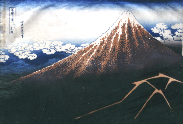 Tratta dalla serie Fugaku sanjurokkei (Le trentasei vedute del monte Fuji). La massa caratteristica del Fuji campeggia in primo piano su quasi tutto il riquadro, spostata verso destra, mentre le montagne sullo sfondo sono suggerite da pochi tratti avvolti da nubi grigiastre, ritmate a loro volta dal continuo rincorrersi, leggermente più in alto, delle nuvole bianche a brevi volute. L'effetto caratterizzante e qualificante di questa solitaria immagine è la prepotenza del segno formato dall'aguzzo scontro di poche linee nell'angolo in basso a destra: il segno tagliente del fulmine ma, contemporaneamente, viene sintetizzata tutta la furia del temporale che investe il Fuji.