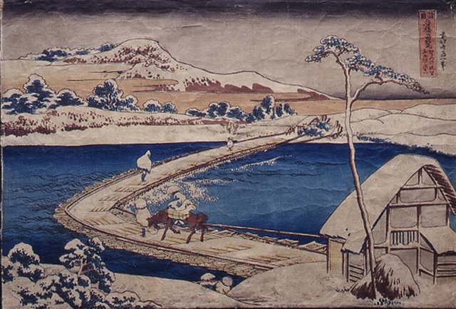 La schematizzazione delle forme tradizionali del paesaggio fa ricercare nuovi impulsi dalla grafica prospettica occidentale conosciuta, a mezzo degli olandesi, da tutto il Settecento. Il riuscito espediente prospettico del ponte a boomerang, che unisce le due rive e crea la profondità dell' inquadratura, è accentuato dallo "slontanare" delle figurine che lo attraversano e dalle due capanne all'estremità. Il paesaggio è l'elemento dominante e al suo interno si muovono le piccole figurine dei viandanti. In questa serie, i ponti si inseriscono nella natura e ne diventano una parte integrante, creando una mediazione tra la natura stessa e il mondo umano. La serie è stata pubblicata da Nishimuraya Yohachi (Eijundo), lo stesso editore delle Trentasei vedute del monte Fuji.
