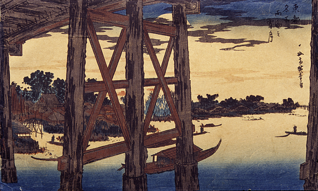 La stampa appartiene alla serie Toto meisho (Luoghi celebri della capitale orientale). In questa stampa, Hiroshige riesce a cogliere due differenti punti di vista, articolando l'immagine in un close-up fotografico ante litteram, in cui il particolare del ponte viene rappresentato in primo piano ingigantito e isolato dal resto del paesaggio. Le case, il fiume, le imbarcazioni e la vegetazione sono tutti elementi che fanno da sfondo al particolare reso in primo piano. Il corso del fiume Sumida è sbarrato dai piloni lignei del ponte e tutta la strutture focalizza lo sguardo verso il panorama di fiume, luna e quartiere urbano, affollato di alberi e di edifici, creando ulteriori angolazioni di veduta.