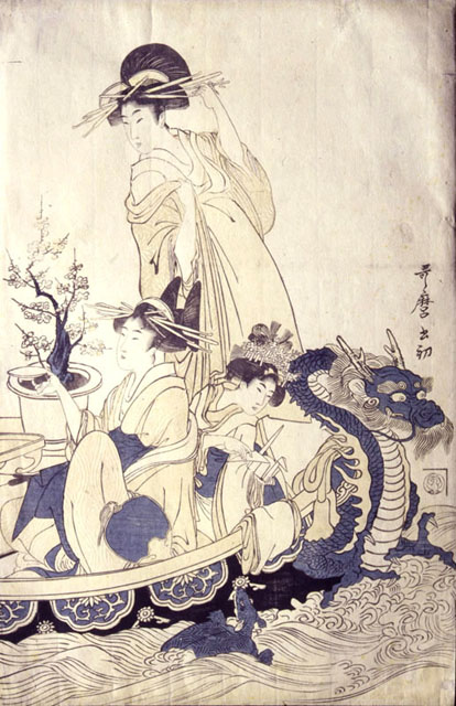 La stampa fa parte del trittico oban che rappresenta cortigiane e ancelle della buona fortuna sulla barca del tesoro per la celebrazione del nuovo anno. La stampa è carica di allusioni e di riferimenti simbolici. Appartiene al genere "mitate", trasposizione in "abiti moderni" di vicende e miti classici. Motivi augurali, gai e festivi, simboli di prosperità e felicità, un drago grottesco e antropomorfo che scivola tra le onde, una tartaruga che osserva incuriosita il corteo, tutto è reso con una gamma cromatica in cui prevalgono gradazioni di rosa contrapposte agli inserti di nero, blu e verde gessoso, accordate alle tonalità sabbiose che pervadono tutta la stampa e sottolineano increspature e ricci delle onde. Una oiran è in piedi, colta nell'atto di inserire uno spillone nella rigonfia pettinatura, di gran moda nei primi anni del XIX secolo; l'altra, acconciata con lo chignon a farfalla, sostiene un ventaglio rigido e rotondo alla cinese e con la mano destra innalza una coppa di sake. La terza figurina medita di lanciare nell'acqua il suo origami augurale di carta a forma di gru. Sullo sfondo si scorge un bonsai di pruno fiorito. Un esemplare completo del trittico è costudito allo Smithsonian Museum.