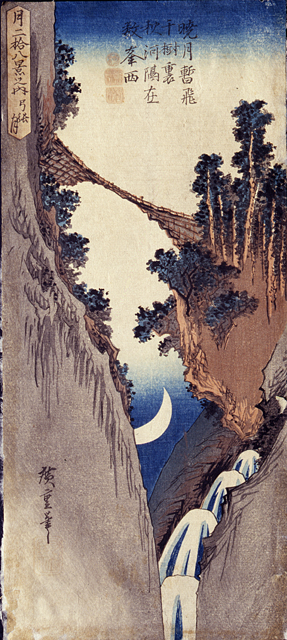 La stampa fa parte della serie incompiuta: Tsuki nijuhakkei no uchi (Serie delle ventotto vedute della luna). In questa stampa si notano alcune delle caratteristiche specifiche dello stile di Hiroshige: il dato naturale: rocce, vegetazione, cascata, è ripreso in modo da cogliere angolature particolari e, nello stesso tempo, catturare l'attenzione visiva dello spettatore. In questa silografia, l'impressione spettacolare è determinata dall'inquadratura dal basso verso l'alto che allunga e rende incombente l'immagine dei due costoni rocciosi. Il luogo ritratto è un luogo famoso: il ponte della scimmia a Enkyo, una località vicino al monte Fuji. La poesia cinese di Kanshi è dedicata a questo ponte pericolante e fragile consono all'abilità di una scimmia più che a un viaggiatore umano. Altri esemplari della stampa sono presenti nelle collezioni dell'Art Institute Chicago, Harvard Art Museum e del Museum of Fine Arts di Boston