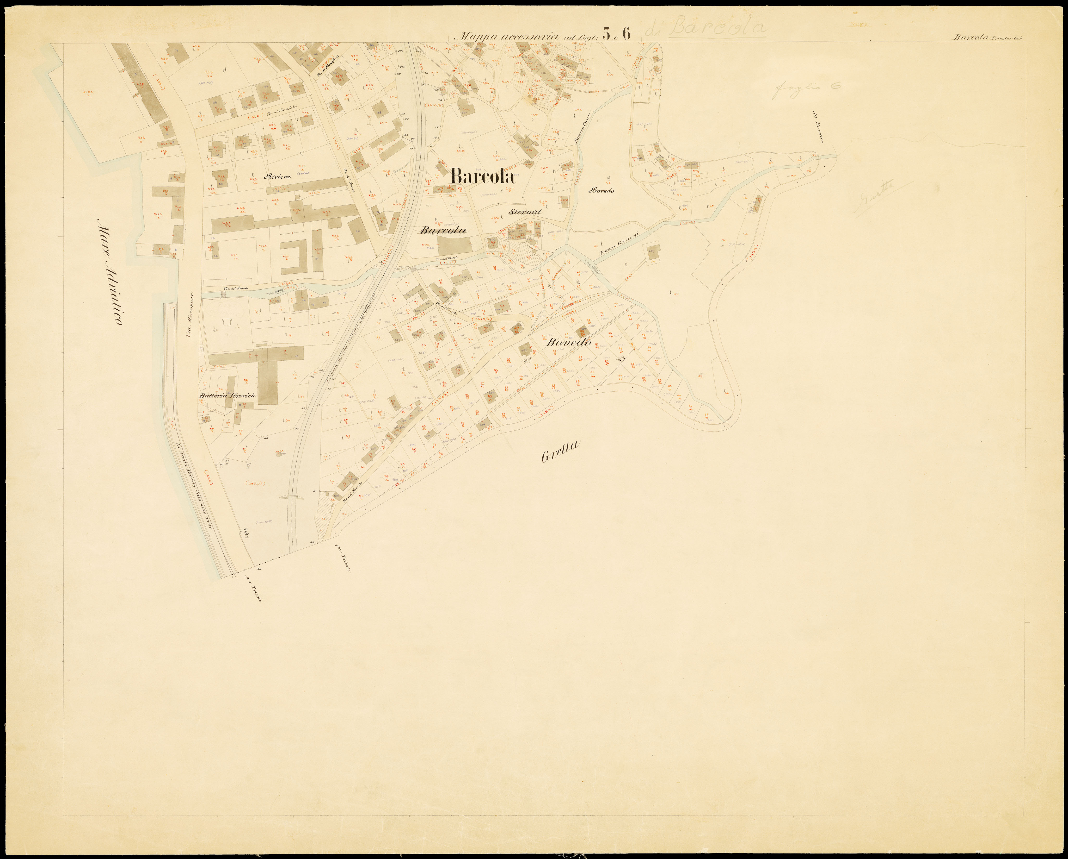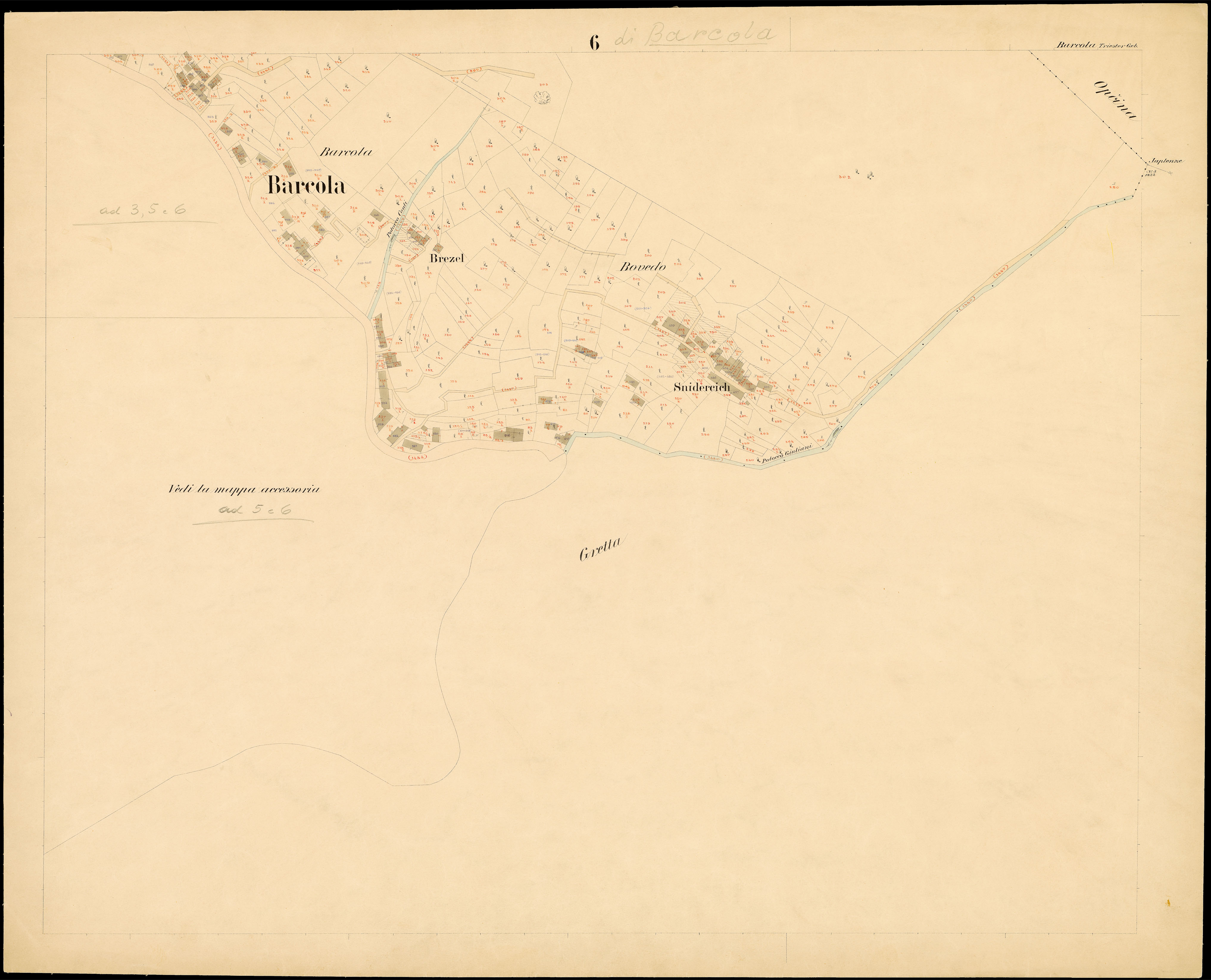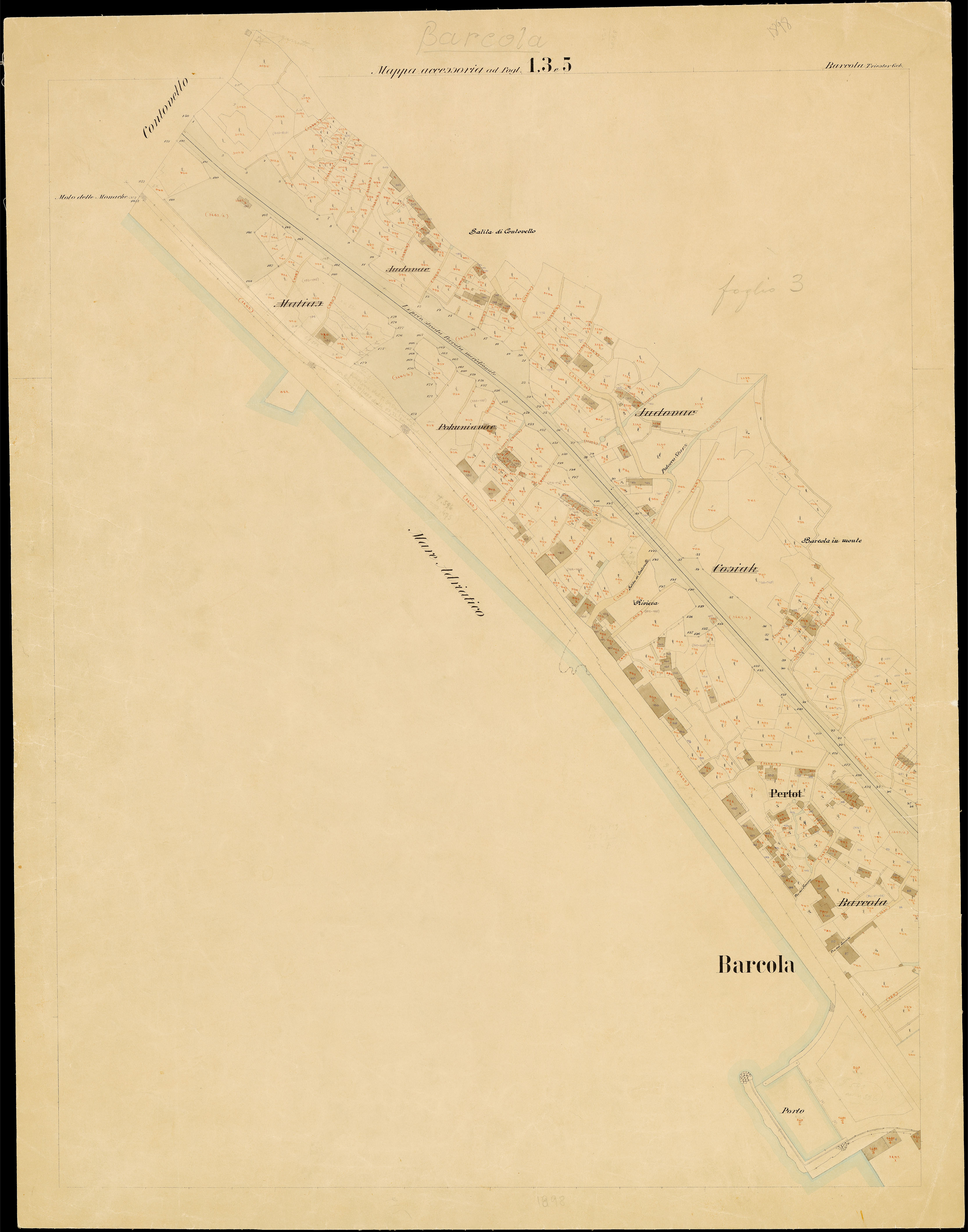 Toponimi presenti: Monte Salvia, Cosiak Superiore, Judovac, Strada d'Italia, Starz, Martellanz, Bovedo, Barcola, Cosiak Inferiore, Bovedo, Sternat. Riviera, Batteria Krecich, Molo delle monache, Salita di Contovello, Judovac, Pokunianac, Barcola in monte, Riviera, Pertot, Barcola, Porto, Potocco Starz, Potocco Giuliani, S. Bortolo, Matias