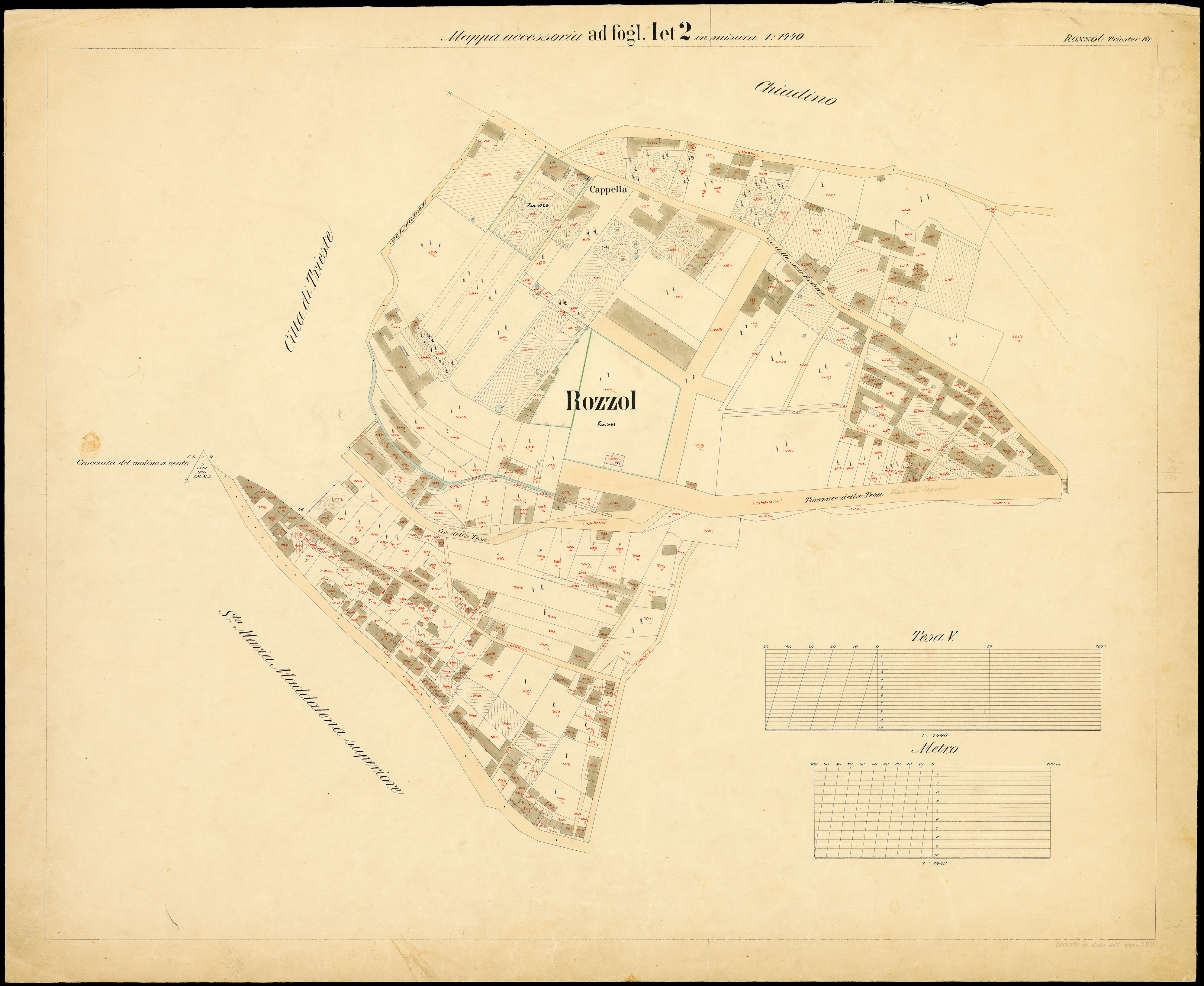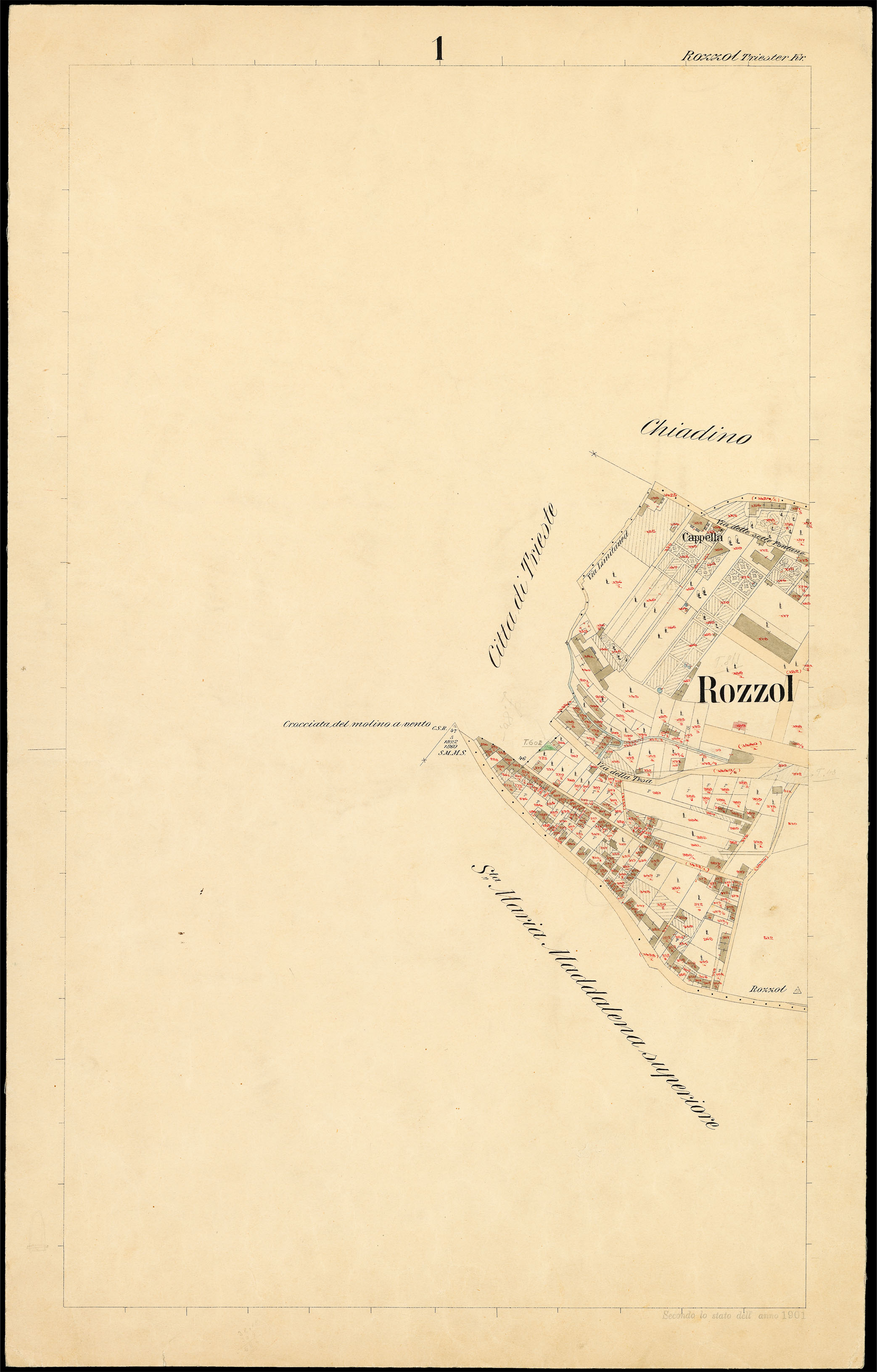 Rozzol nel Litorale Territorio di Trieste : distretto steorale di Trieste : litografato nell'i.r. Istituto litografico del Catasto secondo lo stato dell'anno 1901, misurato nell'anno 1860