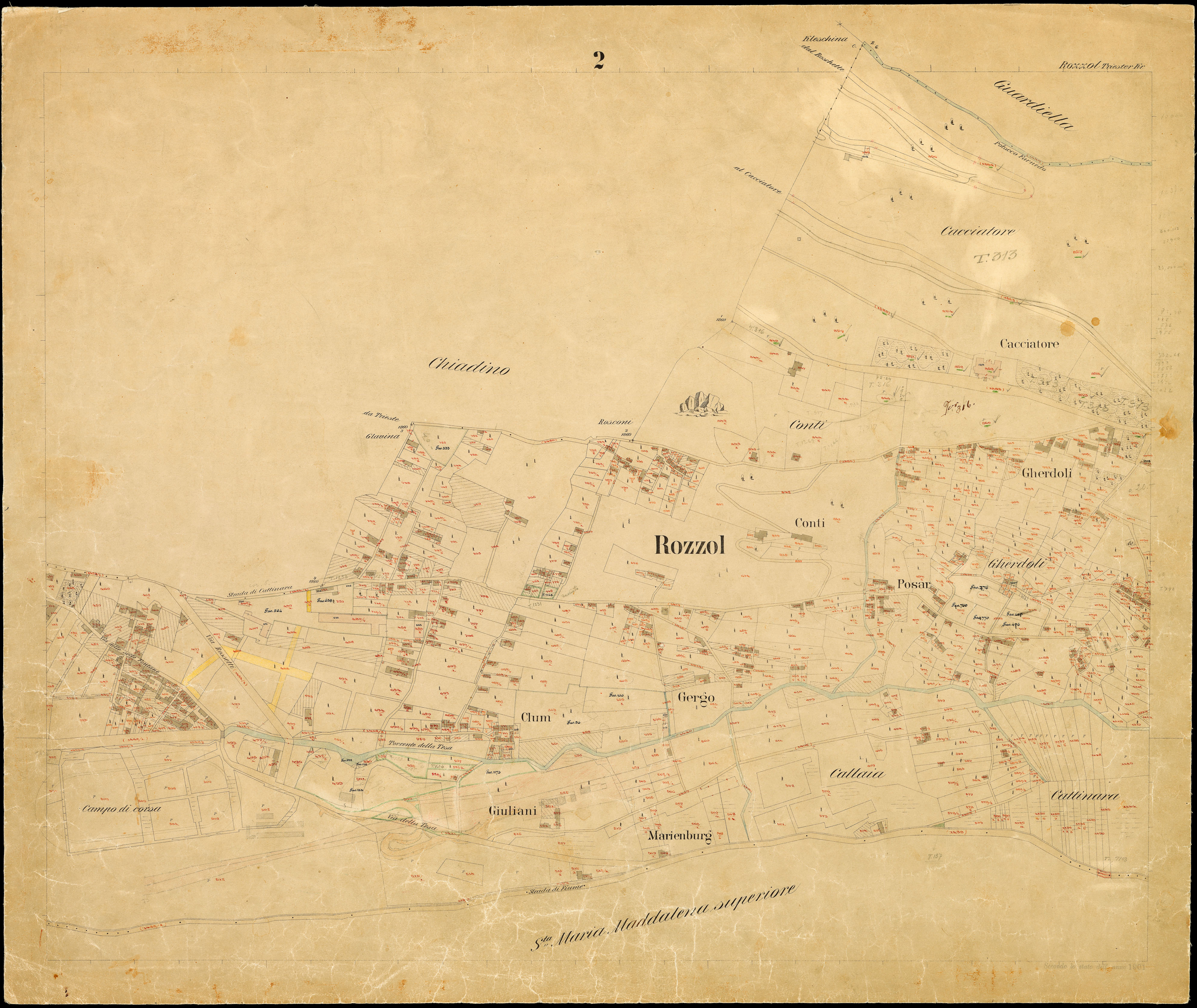 Toponimi presenti: Cappella, Cacciatore, Gherdoli, Conti, Posar, Clum, Gergo, Giuliani, Marienburg, Callaia, Cattinara, Campo di corsa, Villa Revoltella, Schilani, Svab, Melara