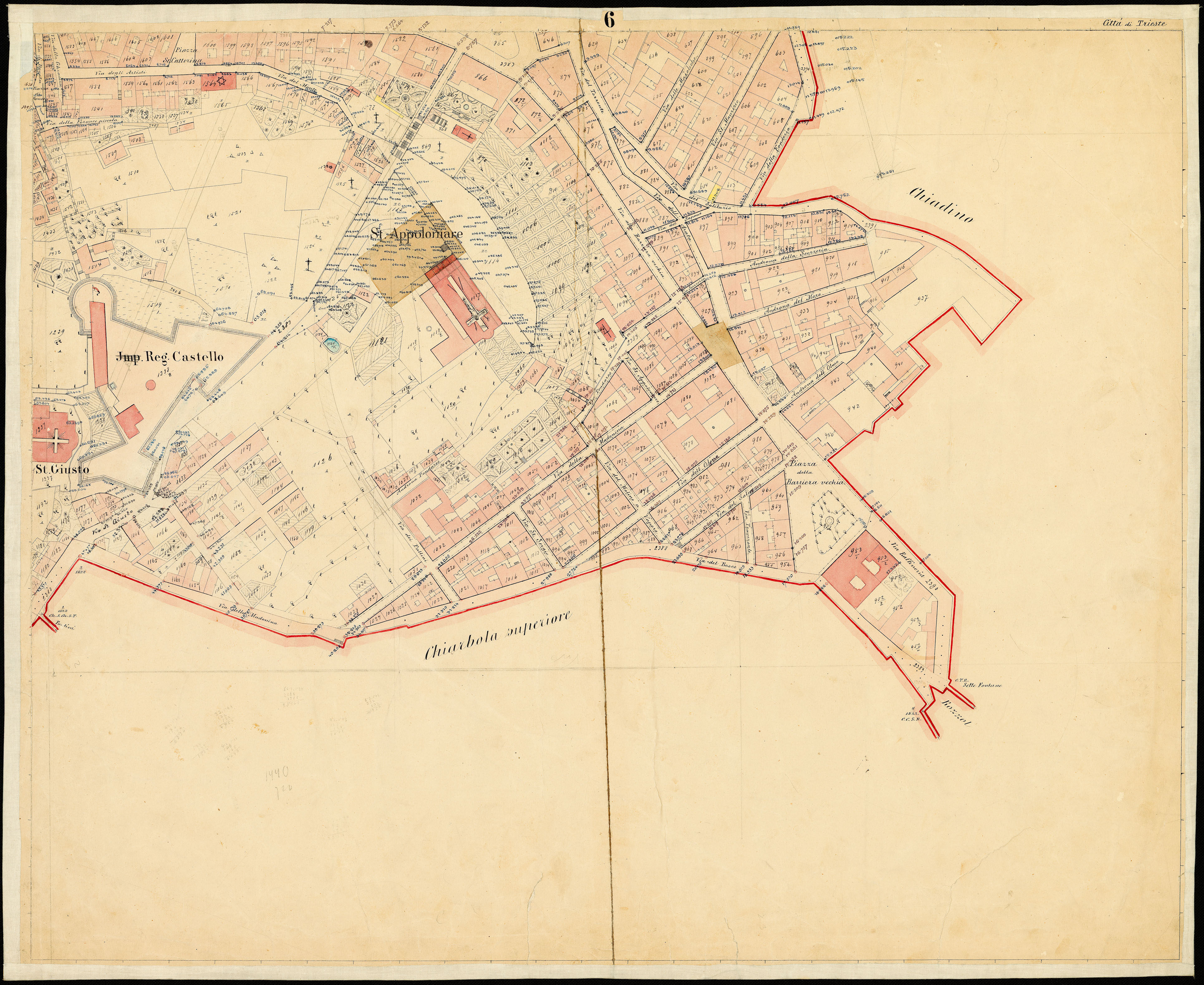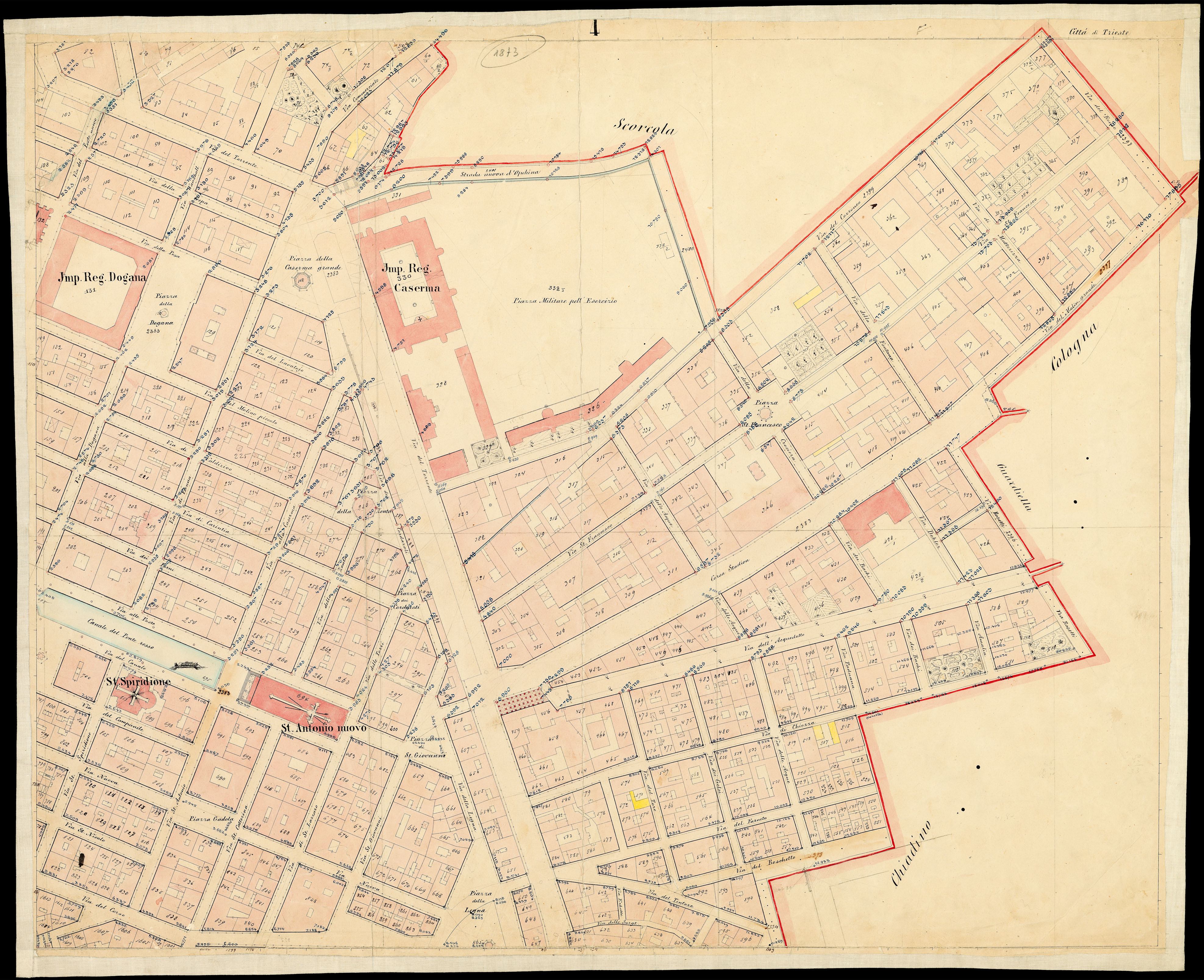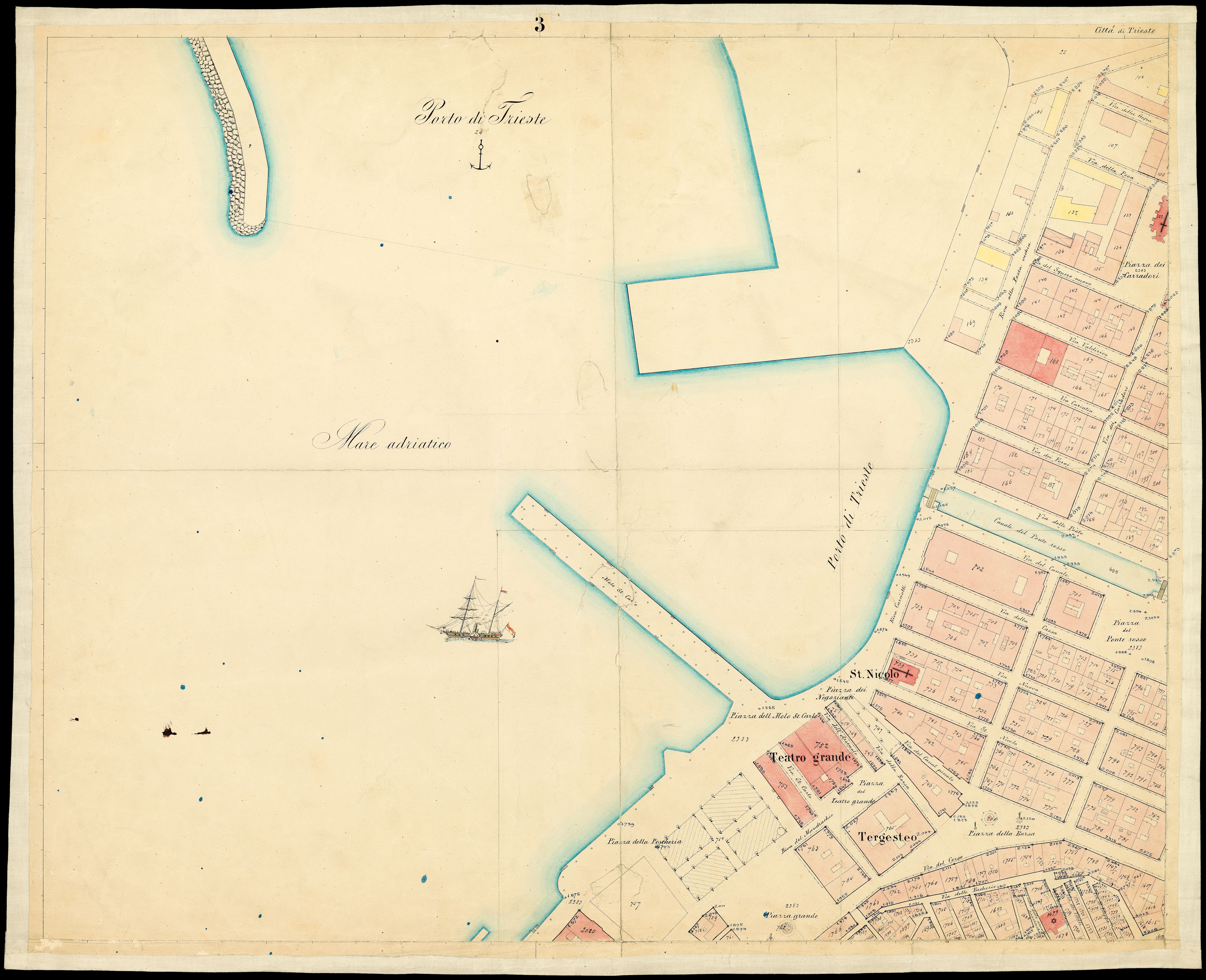 Principali toponimi presenti: Stazione di Trieste, Piazza Scorcola, Piazza dei Carradori, Piazza del Ponte Rosso, S. Nicolò, Piazza dei Negozianti, Piazza del Molo St. Carlo, Teatro grande, Tergesteo, Piazza della Borsa, Piazza Grande, Piazza della Pescheria, Piazza del Teatro Grande, Piazza della Caserma, S. Spiridione, S. Antonio nuovo, Piazza Gadola, Piazza della Legna, Piazza S. Giovanni, Piazza della Caserma, Imp. Reg. Caserma, Piazza Militare pell'Esercizio, Piazza dei Cordaroli, Piazza Giuseppina, S. Antonio Vechio, V. B. Grazie, Piazza della Valle, S. M. Maggiore, Piazza della Cattedrale, S. Giusto, S. Appollonaire