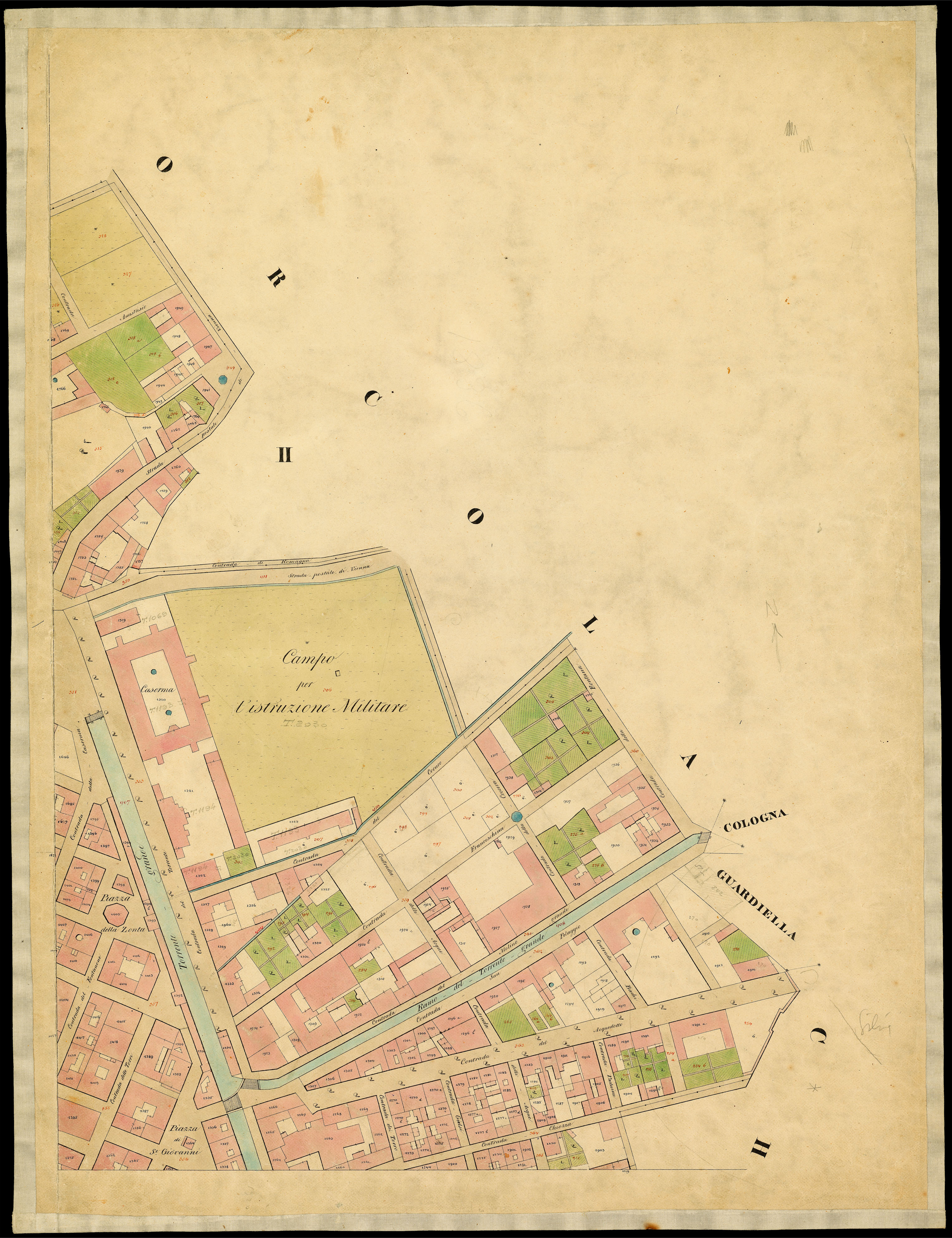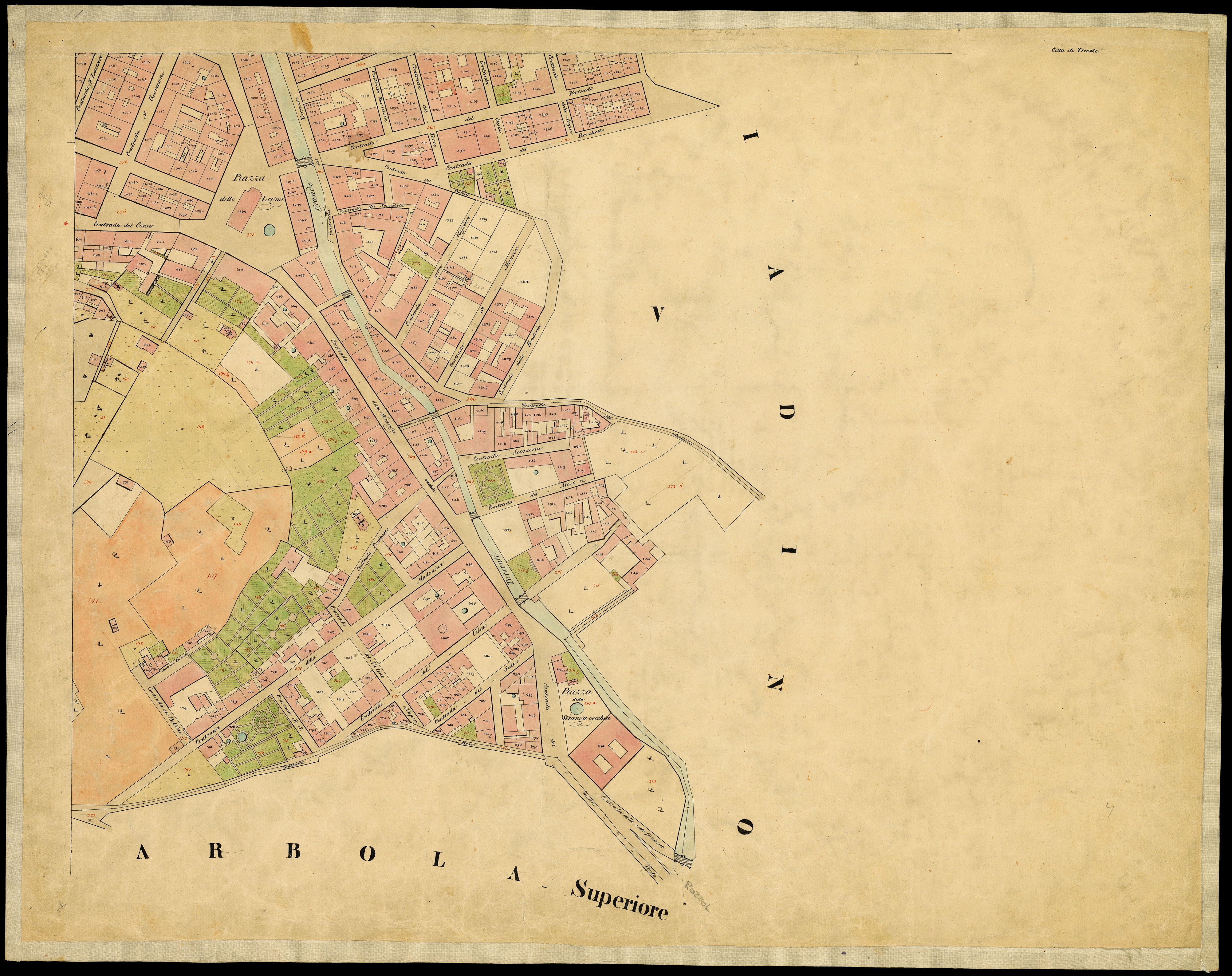 Principali toponimi presenti: Principali toponimi presenti: Il Macello, Molo Clutsch, Squero, Torrente grande, Piazza dei Carradori, Dogana, Magazeno di Sali, Canale del Ponte Rosso, Piazza del Ponterosso, Piazza della Borsa, Piazza del Teatro Nuovo, Piazza del Molo S. Carlo, Casa Governiale, Molo del Mandrachio, Piazza S. Carlo, Campo per l'istruzione militare, Caserma, Torrente grande, Piazza della Zonta, Piazza di S. Giovanni, Contrada del Fontanone, Contrada delle Torri, Contrada dei Torro, Contrada Gelsi, Contrada delle Acque, Contrada Chiozza, Contrada Paduina, Contrada del Acquedotto, Contrada San Pelaggio, Contrada del Molino grande, Contrada franceschina, Piazza Giuseppine, Contrada del Lazzaretto vecchio, Contrada SS. Martiri, Contrada Belpoggio, Contrada della Sanza, Piazza della Sanità, Piazza Lipsia, Piazza S. Antonio, Piazza S. Silvestro, Piazza Grande, Castello, Cattedrale, Piazza delle Legna, Contrada Scorzeria, Contrada del Moro